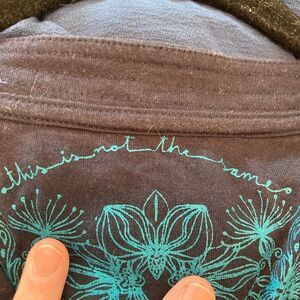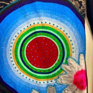 Artistic Avant guard long sleeve top with intricate patterns. V neck Features bold circular and floral designs. Perfect for adding color to your outfit. Drawstring Ruched side tie. Bottom is layered. The body is stretch material like a high quality T but appliquéd velvet daisy w/ sequins. Brand embroidered on back. V neck perfect condition. Vintage. Pit to pit 17” and shoulder to hem 26.5”.