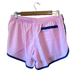 Keywords: running shorts, athletic shorts, womens shorts, blue trim, elastic waist, workout shorts, gym shorts, sportswear, activewear, medium shorts, pink shorts, comfortable shorts