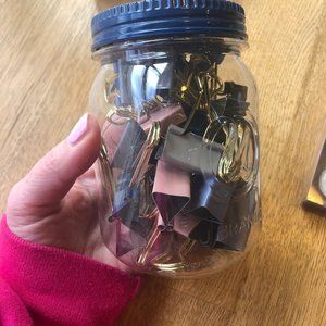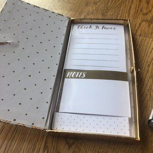 Desk Accessory Set. Super cute and perfect for the office or a teacher's desk! Comes with a jar of binder clips, some notepads, magnets, paper clips, erasers, and clothes pins. Really pretty white and gold color scheme! The jar of binder clips has more colors! All new and unused. Most purchased at Target. Feel free to ask any questions :)