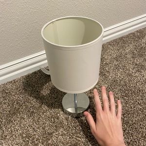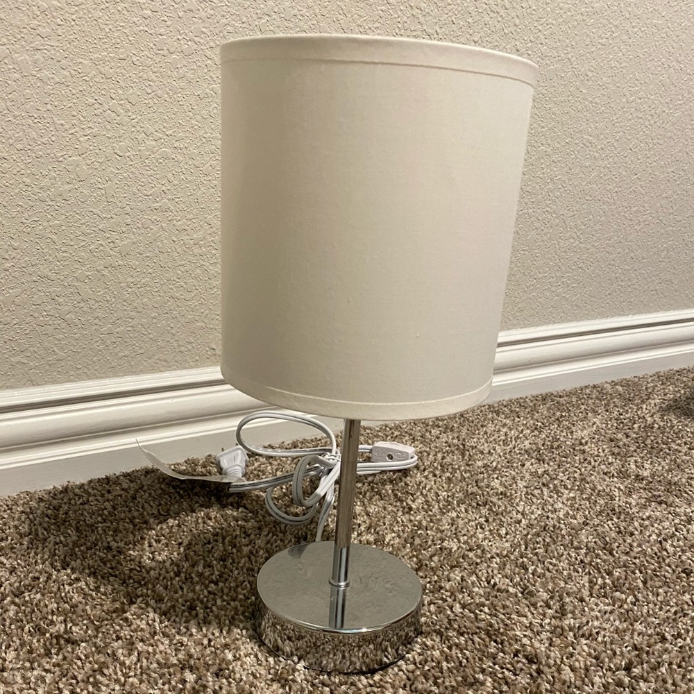 Small silver desk lamp with white shade, gently used and in great condition.
