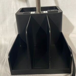 Desk lamp with compartments for office supplies pulse an outlet and USB port.