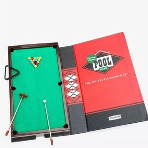 Great executive stress reliever! You can shoot pool right at your own desk! Book-size box opens to reveal a desktop edition of your favorite game, crafted with paper, felt, metal and plastic components. When playtime is over everything fits nicely back into the box and slides onto your bookshelf or stores in your desk.