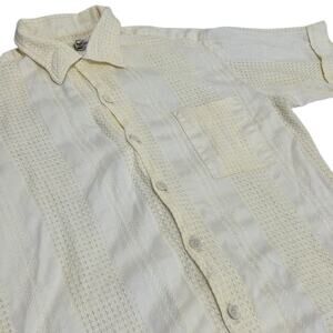 Soft vintage short sleeve button-up from Desmonds Palm Springs. Features a breathable textured stripe fabric in cream with front pocket, pointed collar, and adjustable side buttons at hem. Classic retro resort vibe. Good condition.