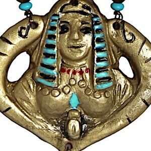 This earring was inspired by the ornate Egyptian earrings worn in the 1985 movie. It is not intended to be an exact copy. The head is made of hand-poured, molded plastic which is etched and painted by hand. The beading, wire, pins, attachments, and other findings may contain brass, glass, plastics, imitation turquoise, semi-precious stones, stainless steel, and/or different metals and/or metal alloys. The earring is backed with metallic sheepskin pebbled leather.