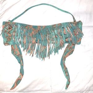 Despite fringe bikini top in vibrant turquoise and orange. Perfect for beach days.