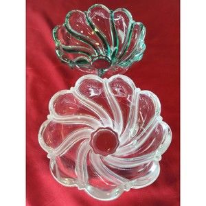 Set of two dessert/candy/nut bowls made in Germany by Mikasa, one is clear with peppermint green stripes and the other is clear with frosted stripes. Each dish measures 3 in high x 5.5 in diameter and weighs 1 lb.