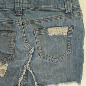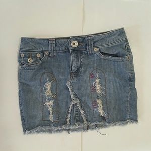 Dessert patchwork jean skirt with embroidered detail pachs festering a bird and floral design around 11.5 inches long