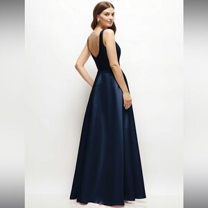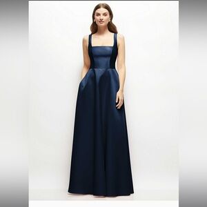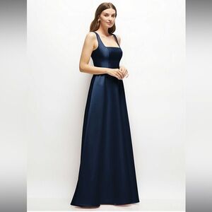 Dessy Collection. Features a full skirt and square neckline. Crafted from satin twill. This was worn for a few hours. Still has the tag on. Perfect condition. Unaltered a true size 8 from the website with extra length added to original order (I’m 6’2”) can be hemmed to the length you need. Ask any questions