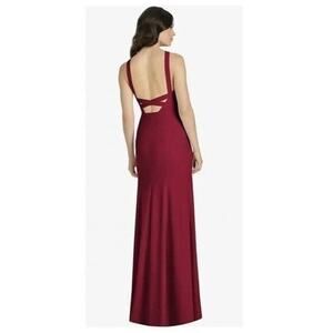 Elegant burgundy dress. Sleeveless with high neckline. Features a stylish back design. Perfect for weddings.