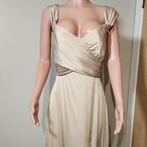 This stunning cream gown by Dessy Collection features a ruched sweetheart neckline and elegant spaghetti straps. Perfect for weddings or formal events, the dress flows gracefully to the floor, creating a sophisticated silhouette.