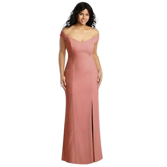 Dessy Collection Off Shoulder Cross Back Trumpet Gown Desert Rose Size 16