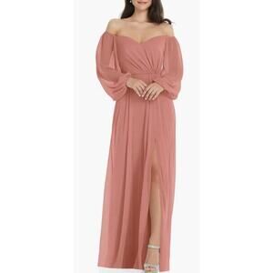 Elegant off-shoulder design. Soft blush color. Flowy silhouette with front slit. Perfect for weddings.
