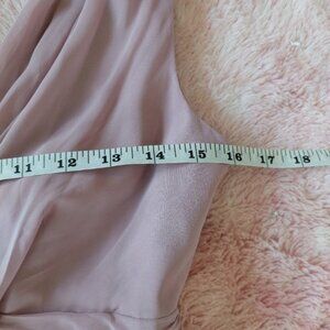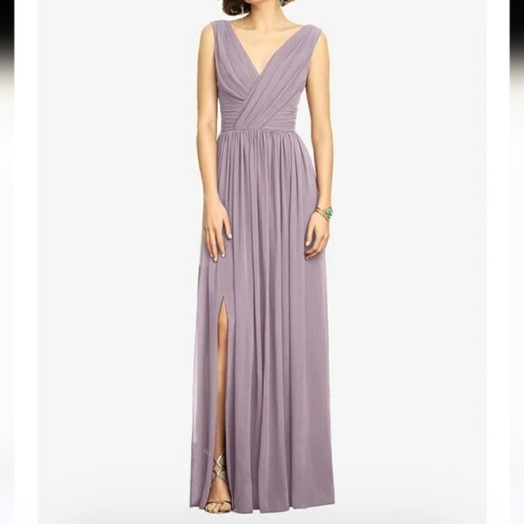 Dessy Collection Sleeveless Draped Chiffon Maxi Dress Front Slit Size 4. Pre-owned, has a small oil stain in the back as pictured. Color dusty rose