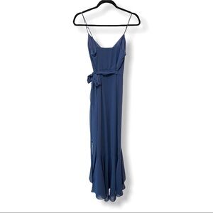 Social Bridesmaids Sailor Blue Crepe Flowy Ruffled High Low Faux Wrap Gown from Dessy Collections Bridal