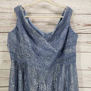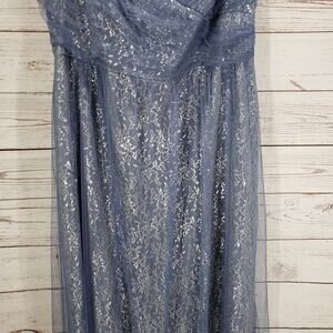 Dessy Collection Vivian Diamond - Women's Blue Off Shoulder Soft Tulle Over Rococo Lace Zip Back Closure Dress Size 26. Shell 100%Nylon Tulle. nylon, mylar. Lining 100%Plyester. Approx. measurements pit to pit 25 in. Waist 45 in. Dress length 60 in. Pre-owned in good condition, no holes or stain.