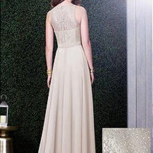 This is a full length sleeveless sheer crepe dress. Classic beautiful rococo lace bodice and a nu-georgette sash at her natural waist, and a modified circular skirt that creates a balanced silhouette. Back center zip.