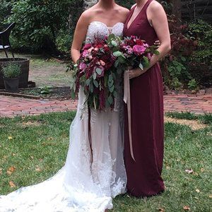 Once worn, Dessy Group Cabernet V-Neck Backless Pleated Front Jumpsuit with pockets1 Dry-cleaned & ready to ship. Jumpsuit was hemmed (5'5" with 2" heels) and brought in at waist 1/2" on each side.