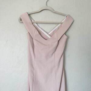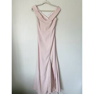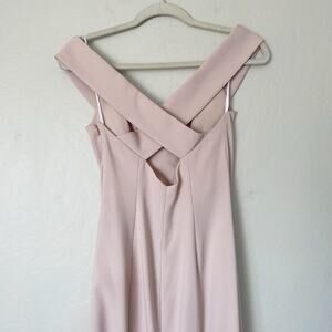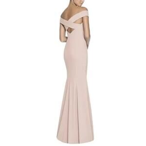 Dessy Off-The-Shoulder Criss Cross Back Trumpet Bridesmaid Gown in Blush Pink