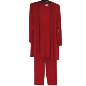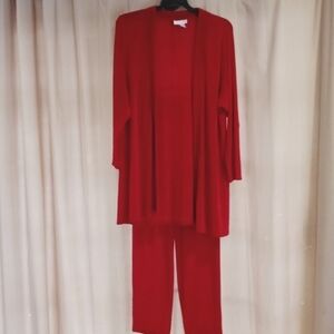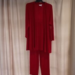This is a beautiful pant suit Destinations by Mava spandex and acetate material. Absolutely stunning for a Christmas outfit very dressy or even professional-looking you can't go wrong with this burgundy red color. Be ready for the evening or dress to impress