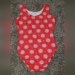 Dive into fun with this vibrant one-piece swimsuit, showcasing a lively red hue complemented by disco balls. The classic tank design and scoop neckline provide a comfortable fit, perfect for any swim adventure.