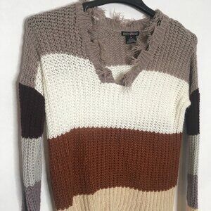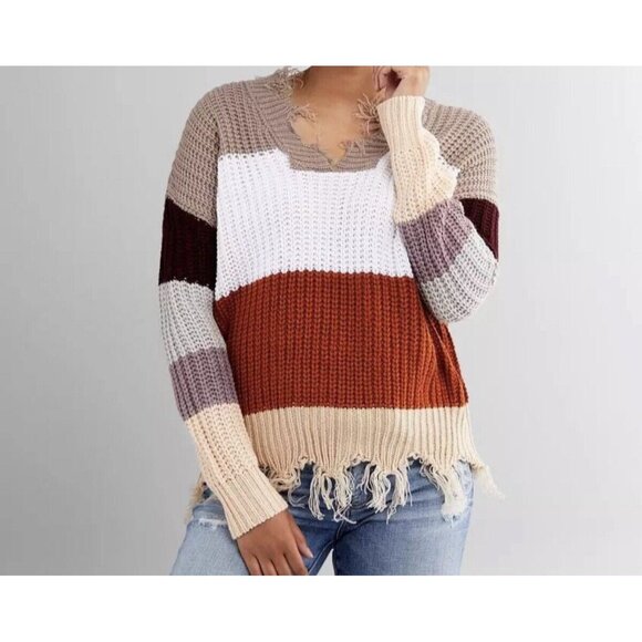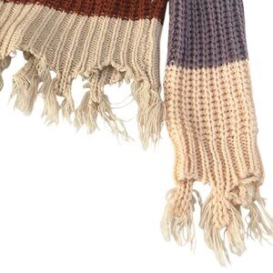 Destructed Sweater Women's Medium Fringe Chunky Knit Striped Colorblock