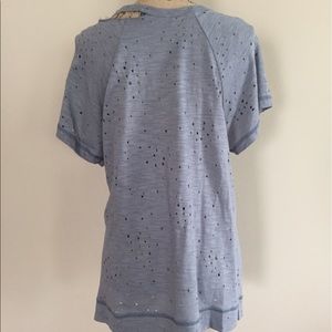 Slub knit concrete gray destructed tee. Crew neckline, short sleeves, slouchy relaxed fit. Splits at hip seams for styling. The perfect amount of destruction to this tee! 100% cotton. Made in USA. S-bust 21", length 27", M-bust 22", length 28", L-bust 23", length 29 1/2".