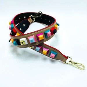 Funky strap with chic, multi-colored studs. Add to any handbag in your collection with O or D rings for instant pop of color removable detachable strap.