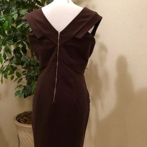 JLo brown dress worn once. Has various detailed design on dress with semi-peplum and back exposed silver zipper. Label was removed. Upper area lining. Fabric - polyester, rayon and spandex. This could fit a medium to large. Laying flat measurements: Armpit-to-Armpit = 18"; Waist = 16"; Hip = 20"; Shoulder to hemline length = 35.5". Jewelry not included.