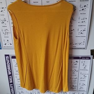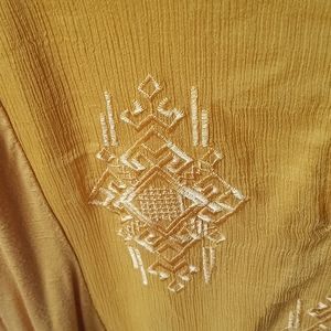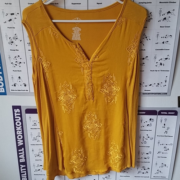 Beautiful embroidery details on front. Golden yellow color. Loose flowing tank top looks great with other layers.