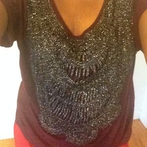 Simply gorgeous! Burgundy top with black knitted,polyester detailing. Falls off shoulders a little, same dip in back as In front, and scrunches at bottom. No snags