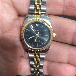Details Diamond Quartz Ladies Two Tone Watch with two tone stainless steel. Black dial with a diamond on the 12 oclock. Pre-owned barely worn, in great shape. New battery.
