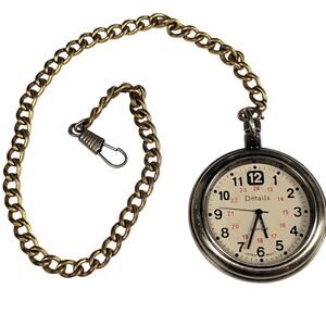 Details pocket watch with a 14-inch chain and quartz movement. The watch is functional, featuring a classic white dial with both standard and military time. Perfect for daily use or as a collectible piece.