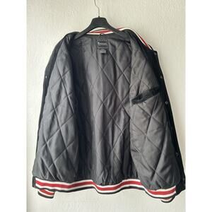 • Style: Varsity bomber, quilted lining, striped ribbed collar/cuffs/hem, snap-front closure