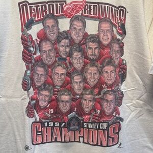 Celebrate the 1997 Stanley Cup victory with this Champion tee. Features Detroit Red Wings graphics. Soft and comfortable short sleeve design. Size XL. No holes or rips but some yellowing due to age. A couple of small stains near the collar (see photo).