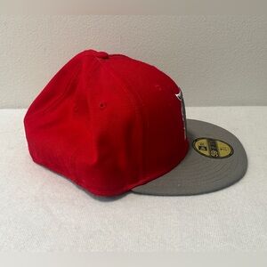 Bold red and gray cap with iconic New Era logo. Perfect fit for style and comfort.