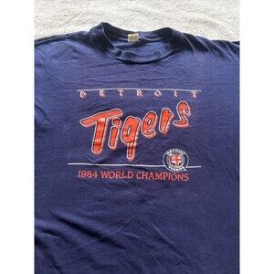Detroit Tigers Vintage 1984 World Series Champions T-Shirt Medium/Large 80's. Tagged as a size XL but due to the age it was produced it fits a bit smaller. Small hole in the left armpit as well as discoloration on the front of the tee. Please see pictures for condition and measurements for proper sizing and fit.