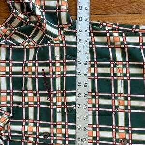 Deus Ex Machina men’s size Large short-sleeve button-up shirt featuring a bold retro plaid pattern in green, cream, and orange. Made from a smooth, lightweight fabric, this shirt has a relaxed fit with a front chest pocket embroidered with the Deus Ex Machina script logo. The interior tag reads “Designed & Custom Built for Motorcycles – Los Angeles,” reflecting the brand’s surf-and-moto heritage and vintage-inspired styling.