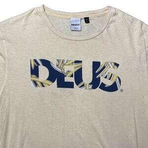 Gently worn cap-sleeve T-shirt from Australian lifestyle brand Deus Ex Machina. Shirt is in a solid light yellow colorway featuring an all-caps "DEUS" brand spellout with blue tropical pattern in the letters.