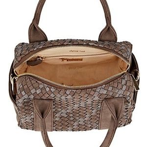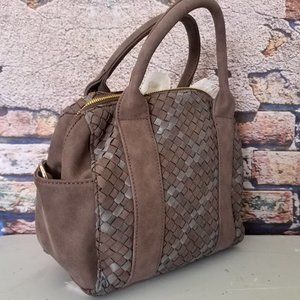 Deux Lux's Delaney mini-duffel bag is crafted of woven brown and grey faux suede.