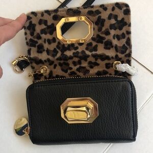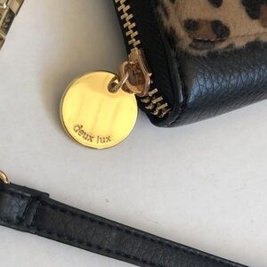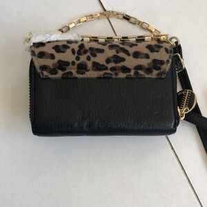 Deux Lux Leopard Clutch Bag. Bag is new but has some marks from hanging in my closet. It is black with a fuzzy leopard fabric and gold hardware. Please note that there is a sharpie mark in the interior as pictured.