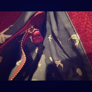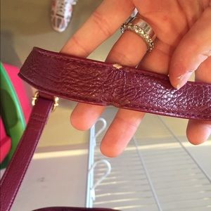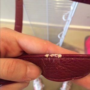 Burgundy faux leather messenger bag featuring two gold buckle snap enclosures. Hand strap as well as detachable shoulder strap. Cloth inside featuring blue bird pattern. Gold spikes along perimeter of bag. Pre-owned but good shape. Some cracking in the faux leather along bottom and shoulder strap (see pics for examples).