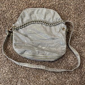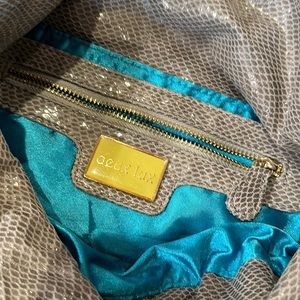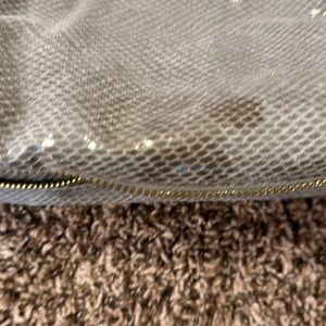 Silver snake skin deux lux bag that can expand, used as clutch or shoulder bag . Gold hardware with adjustable and take away strap . Zip inside pocket and magnetic button closure . Has small stain underneath shown in photo .