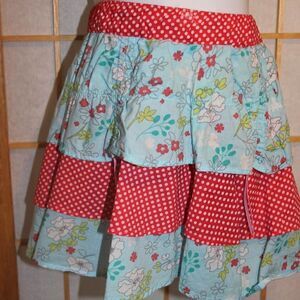 Beautiful layered skirt from deux par deux. Size 2. Floral and polka dotted patterns. Elastic waist. 100% cotton. Machine washable. Made in China. Excellent condition. Nonsmoking home.