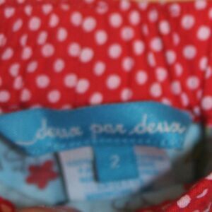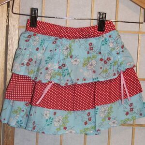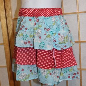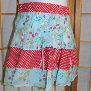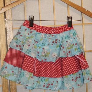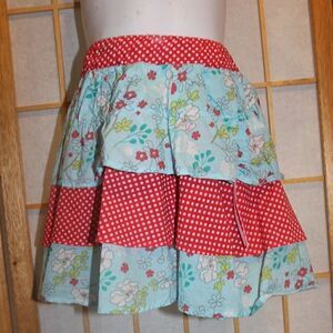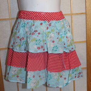 Beautiful layered skirt from deux par deux. Size 2. Floral and polka dotted patterns. Elastic waist. 100% cotton. Machine washable. Made in China. Excellent condition. Nonsmoking home.