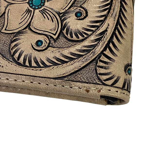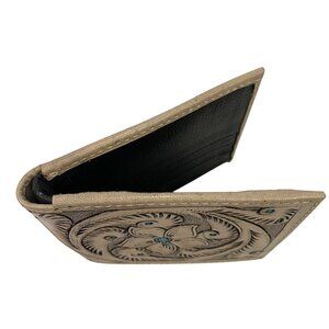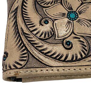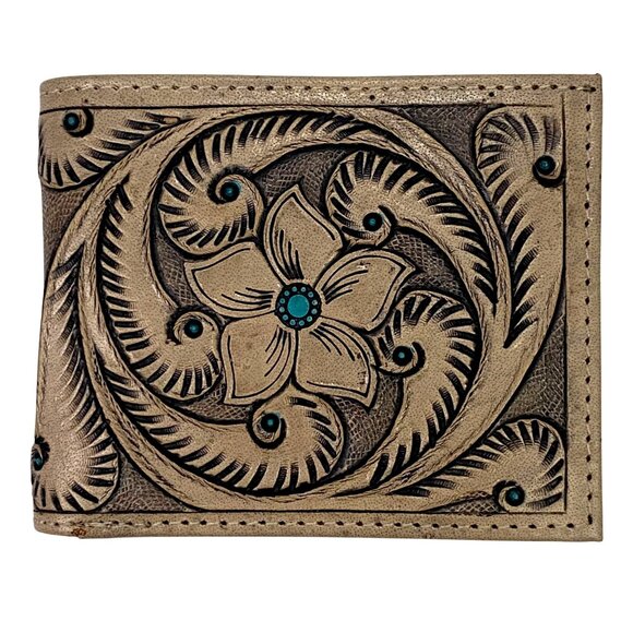 Dev Export Hand-tooled Leather Bifold Wallet Mens Unisex Western Flower Rodeo Cowboy Style Paisley Neutral Color. Multiple card slots and bill slots. Inner snap pocket for change. Shows some staining/blemishes.