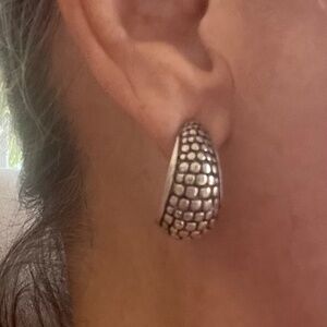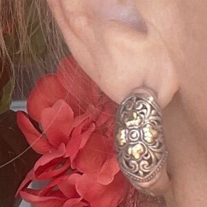 Push backs on both. Texture, visual interest, exotic looking earrings. One J hoop is about 1", the other is bigger about 1 1/2" .