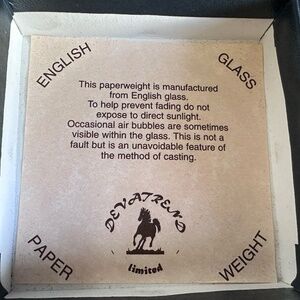 Manufactured by Devatrend, Uckfield, Sussex, United Kingdom, and in very good pre-loved condition, with no signs of damage. Features a picture of fish. Measures approximately 9cm in diameter by 1.5cm thick. Has a felt base with the original label attached: "English Glass Paperweight Devatrend Uckfield Sussex".