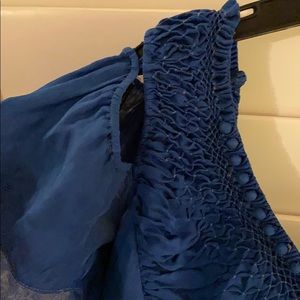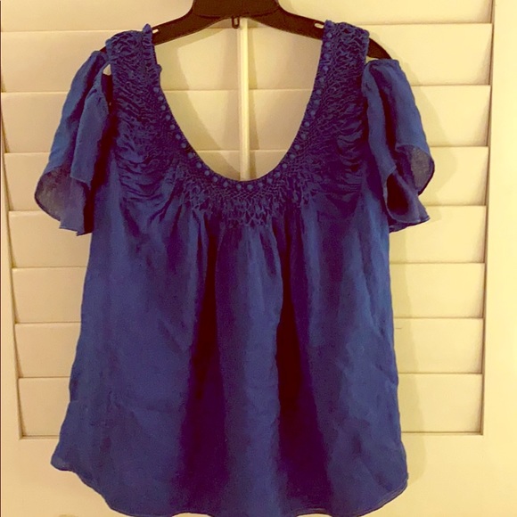 Blue cotton voile flowy top. Shoulders have buttons that can be unbuttoned for cute open shoulder look. Size tag is missing but would fit small to medium