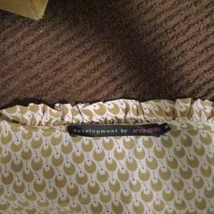Available for sale is the Development by Erica Davies top. It's very soft to the touch and has a pullover style, a mesh sheer insert, wide ruching arm holes, and a wide reverse pleat toward the bottom which falls into an A-line shape. The size tag is 8 (medium), and the measurements are as follows:
