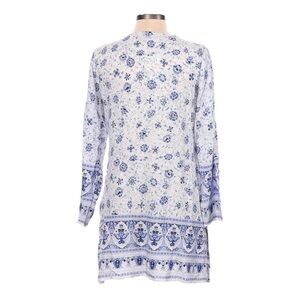 New with tags Devi women’s tunic dress in a beautiful blue and white floral boho print. Crafted from lightweight 100% rayon, this breathable dress is perfect for warm-weather wear. Features 10” side slits for comfort and movement, long sleeves, and a relaxed fit silhouette.